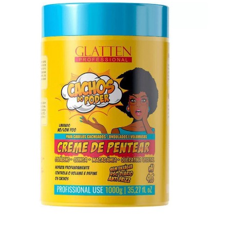 Glatten Professional Cachos do Poder A linha CACHOS DO PODER foi desenvolvida para quem quer ter cachos volumosos, hidratados e cheios de força. Proporciona um cuidado com os fios de forma que promove suavidade e maciez, aumentando a umidade natural com o poder de ativos umectantes e fortalecedores da fibra capilar.Possui Colágeno, que hidrata e previne a quebra, Óleo de Macadâmia, que confere nutrição perfeita, Quinoa, que repõe proteínas, e a Queratina que devolve a massa perdida e o volume natural dos fios. Modo de UsarApós o uso do shampoo e condicionador CACHOS DO PODER, aplique nos cabelos umedecidos massageando do comprimento às pontas. Não enxágue. Penteie naturalmente. Pode ser aplicado sempre que achar necessário, mesmo nos cabelos secos.
